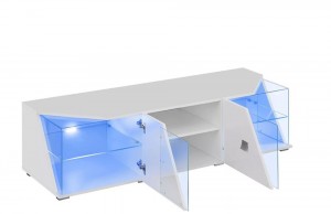 Тумба ТВ: борта, столешница и частично застекленная дверь, за дверью две камеры со стеклянной полкой, освещенной светодиодной подсветкой. Посередине находится отсек со стандартной полкой. Металлические ножки.