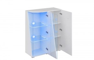 Витрина низкая: одна дверца, боковые и верхняя часть частично застеклены. Одна обычная дверь. За ними 2 стандартные полки и 2 стеклянные полки со светодиодной подсветкой. Металлические ножки.