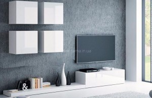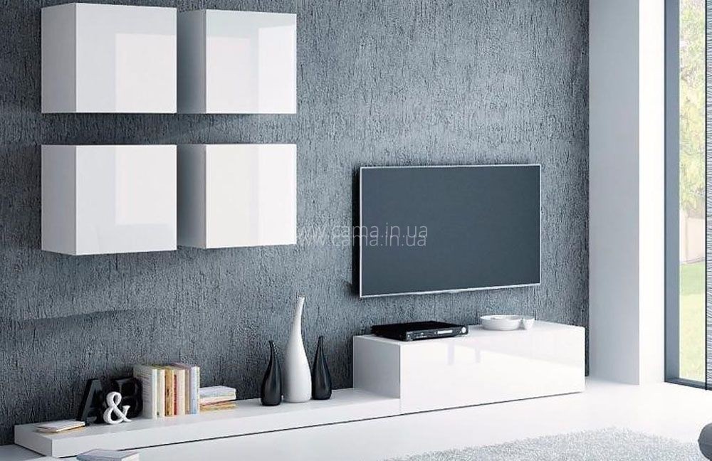 Современная, стильная гостиная Pixel 2 от известной фабрики Cama доступен во многих цветовых вариантах - вы можете свободно выбирать цвет как телевизионных тумб, так и навесных витрин.