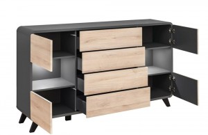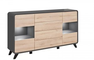 Комод ROUND: два открытых отсека, освещенный белой светодиодной подсветкой. Четыре дверцы с нажимным щелчком, по одному отсеку за каждой. Корпус с загнутыми краями.