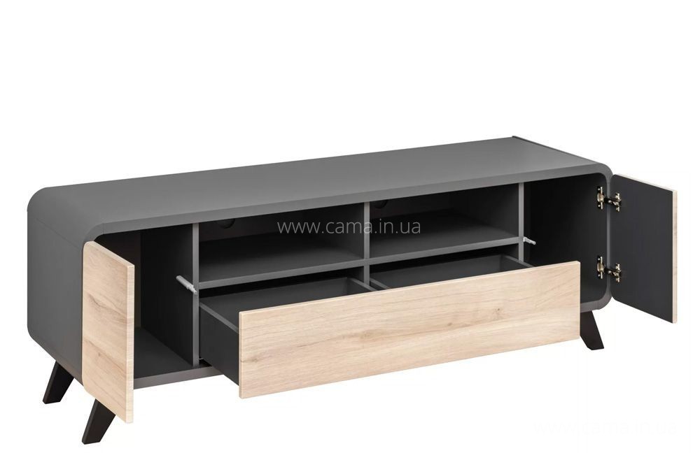 Тумба ТВ ROUND: Справа и слева дверь открывалась нажатием кнопки, за ними одно отделение. В центре вверху два открытых отделения, под двойным ящиком на общей передней панели. Корпус с загнутыми краями.