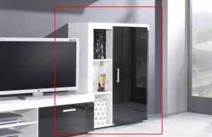 Витрина малая напольная: 114/90/35, один фасад полный глянцевый, внутри две полки обычные, с левой стороны две полки обычные, стекла нет.Материалы: