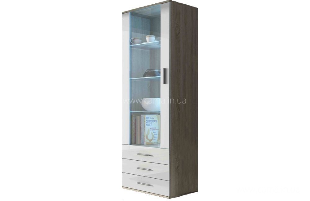 Витрина высокая Сохо: 192/60/41 фасад глянцевый с стеклом, внутри три стеклянные полки с подсветкой, три выдвижных ящика, фасады глянцевые.Подсветка не входит в комплект поставки.Материалы: