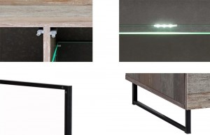 Витрина высокая PLANK: застекленная дверь. За ними две стеклянные полки, освещенные светодиодной подсветкой. Ниже стандартной двери, за ней одна стандартная полка (2 места). Черные алюминиевые стеклянные рамы. Ножки из черного металла.