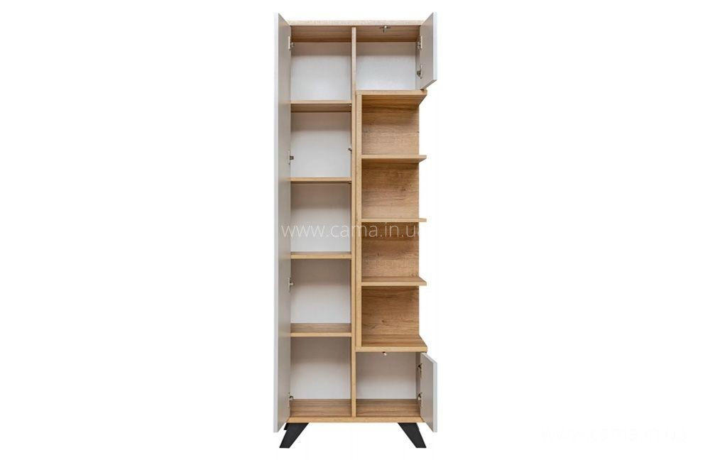 Витрина высокая BOGOTA: полки (4 места), открытые спереди и с правой стороны корпуса. Большая левая дверца, открывающаяся нажатием кнопки, за ними 4 полки (5 мест).