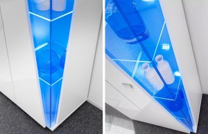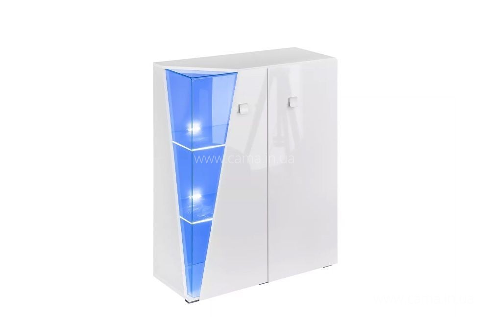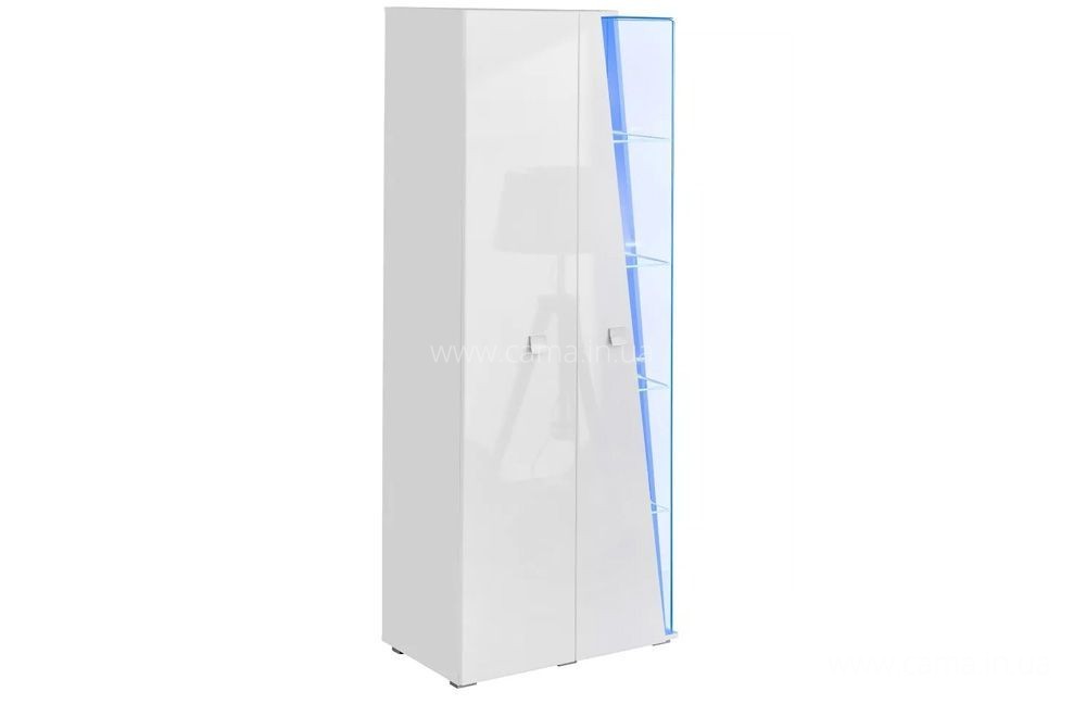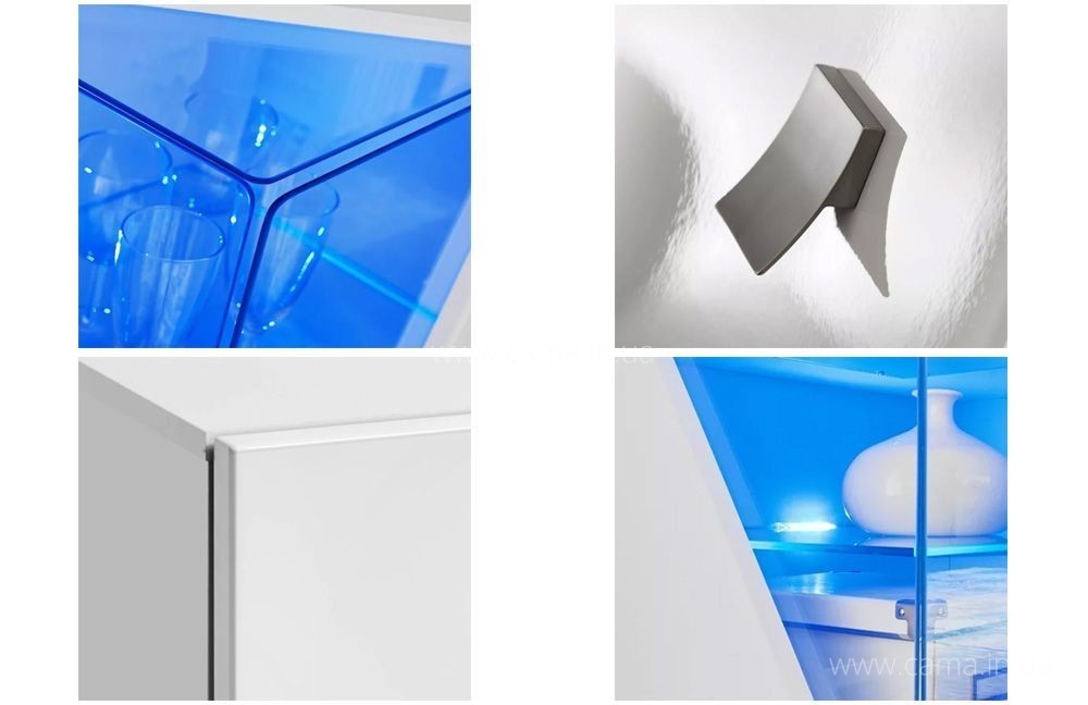 Высокий шкаф: одна дверь, боковые и верхняя часть частично застеклены. Одна обычная дверь. За ними 4 стандартные полки и 4 стеклянные полки со светодиодной подсветкой. Полка Низкая ширма: Одна дверь, боковые и верхняя часть частично застеклены. Одна обычная дверь. За ними 2 стандартные полки и 2 стеклянные полки с подсветкой светодиодной подсветкой. Телевизионный шкаф: борта, столешница и частично застекленная дверь, за дверью две камеры со стеклянной полкой с подсветкой светодиодной подсветкой. Посередине находится отсек со стандартной полкой. Металлические ножки.
