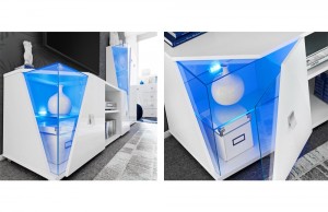 Тумба ТВ: борта, столешница и частично застекленная дверь, за дверью две камеры со стеклянной полкой, освещенной светодиодной подсветкой. Посередине находится отсек со стандартной полкой. Металлические ножки.
