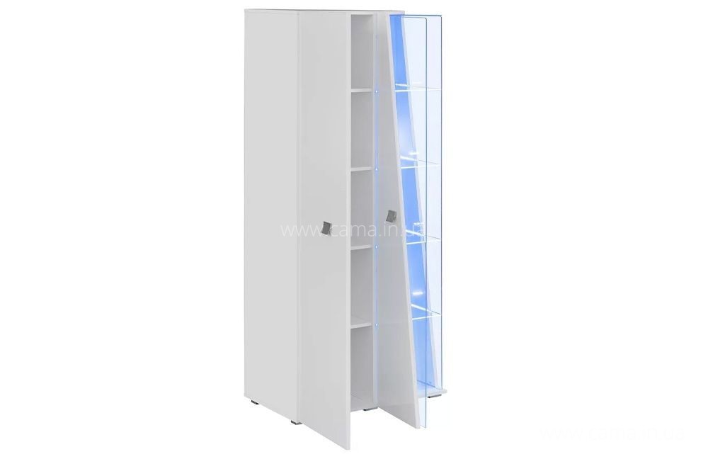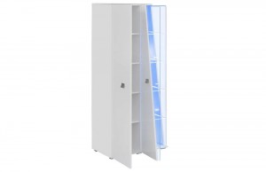 Витрина высокая: одна дверь, боковые и верхняя часть частично застеклены. Одна обычная дверь. За ними 4 стандартные полки и 4 стеклянные полки со светодиодной подсветкой. Металлические ножки.