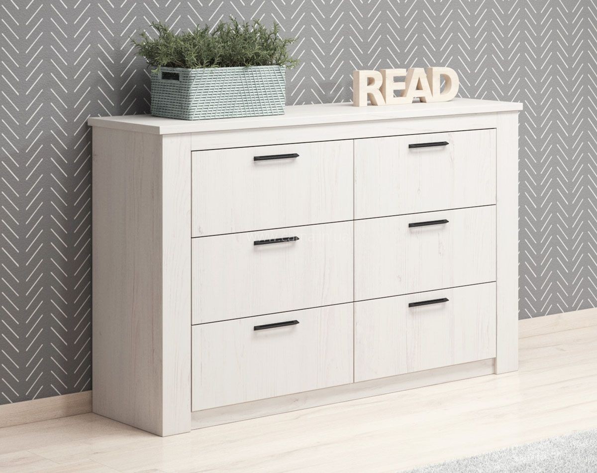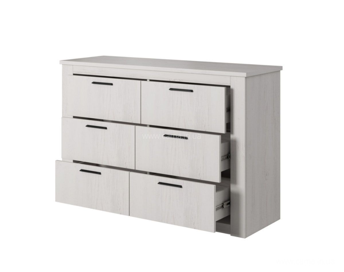 Комод Finn FI 5 мебельной фабрики Cama выполнен в светлом оттенке сосны Андерсен, что создает идеальный контраст с металлическими, черными ручками.