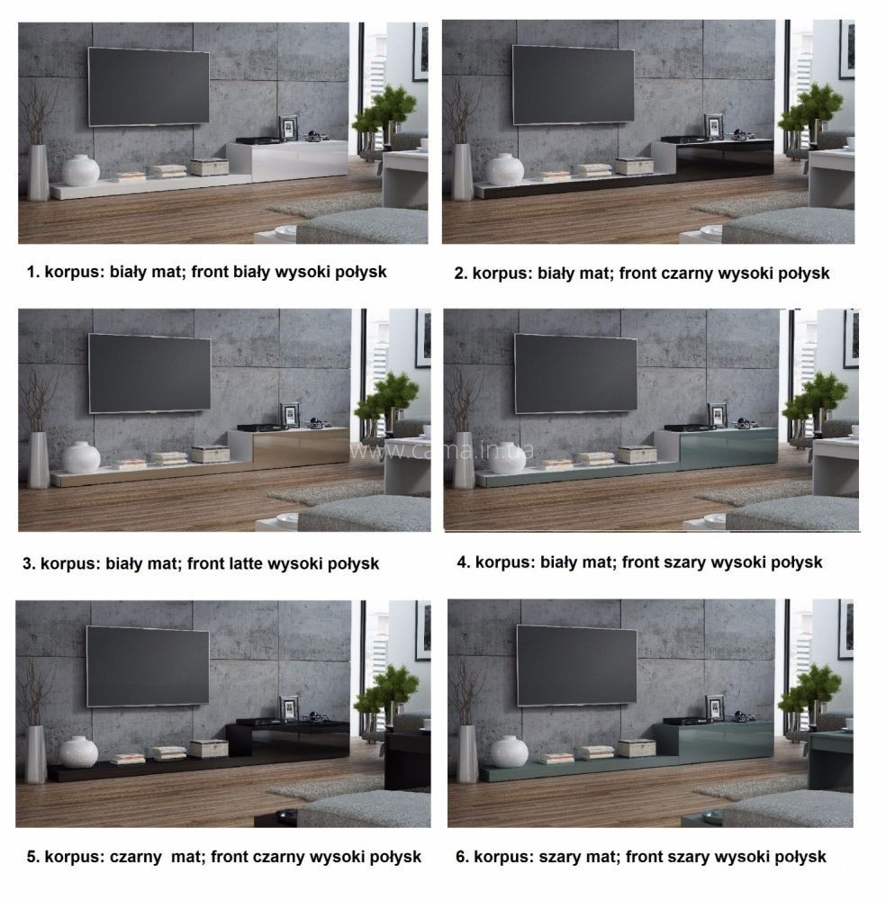 Современная, стильная гостиная Pixel 2 от известной фабрики Cama доступен во многих цветовых вариантах - вы можете свободно выбирать цвет как телевизионных тумб, так и навесных витрин.