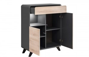 Витрина низкая ROUND: одно открытое отделение, освещенное белой светодиодной подсветкой. Вверху ящик, ниже две дверцы для кнопочных часов, по два отделения за каждой. Корпус с загнутыми краями.