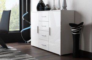 По бокам распашные, глянцевые фасады. По центру выдвижные ящики - 4шт.