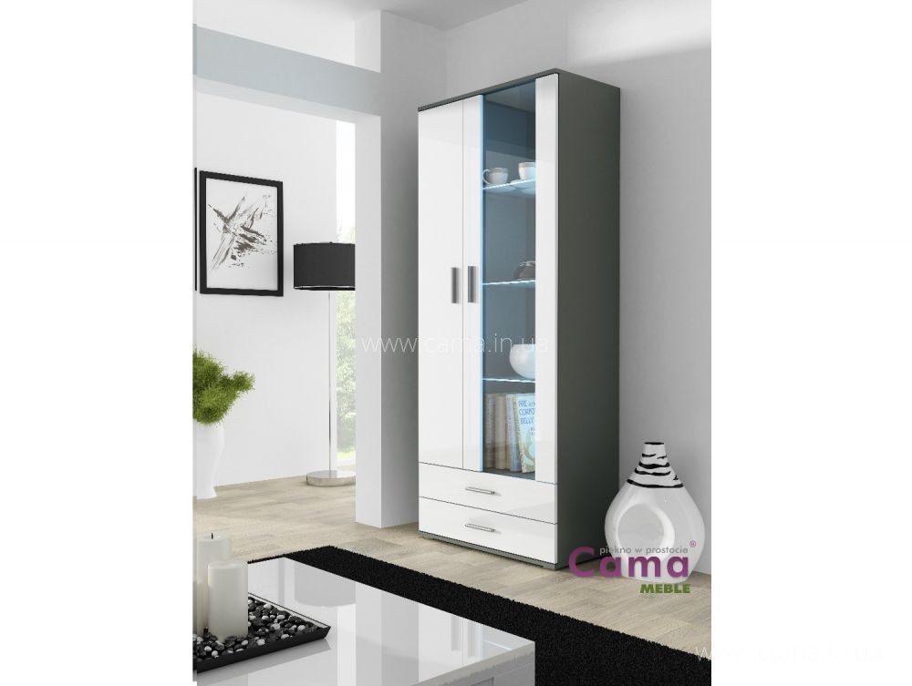 Один фасад глянцевый со стеклом, внутри три стеклянные полки с возможностью установки 3 Led подсветки, второй фасад глухой,глянцевой,внутри три полки обычные, внизу два выдвижных ящика, фасады в глянцевые, установка дверей универсальная ( право/лево).Подсветка не входит в комплект поставки.