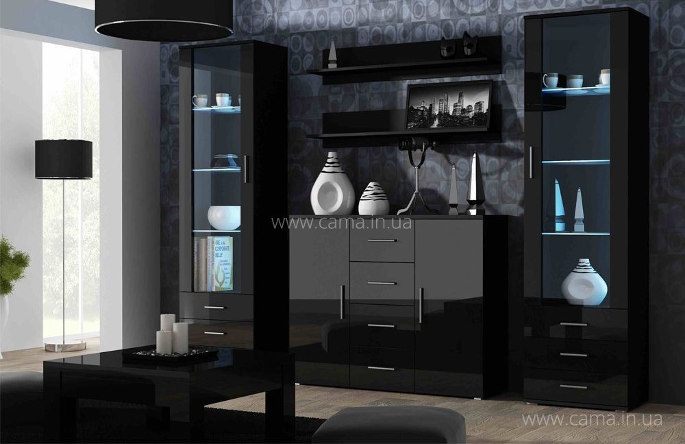 Soho 3 - одна из самых красивых комбинаций элементов модульной системы Сохо фабрики Кама, в данный комплект входят две высокие витрины, навесные полки, и комод.