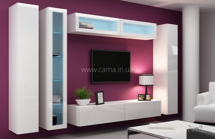 Гостиная Vigo 6 очень интересная комбинация из 6 элементов модульной системы Виго Кама, в этом наборе использован комод РТВ 180см длинной, два глухих пенала высотой 180см, одна витрина высотой 180см, и две маленьких витрины - высотой по 90см.