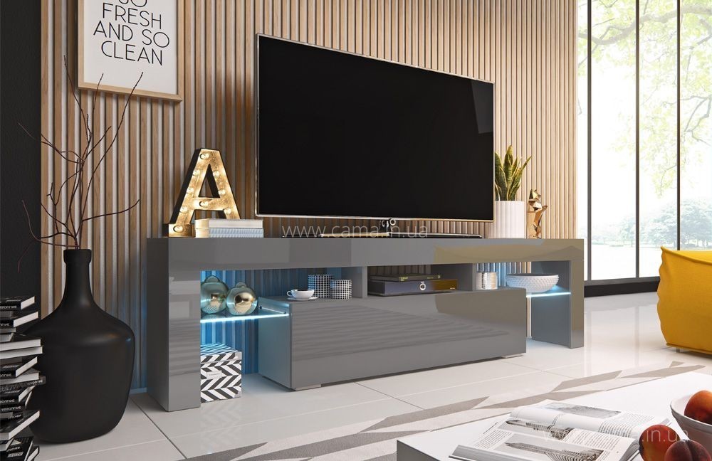 Cama TORO тумба  для телевизора 158 см шириной, спереди открывается вниз, за ​​дверкой находится ниша для техники, так же есть две стеклянные полки, с возможностью подключения подсветки.